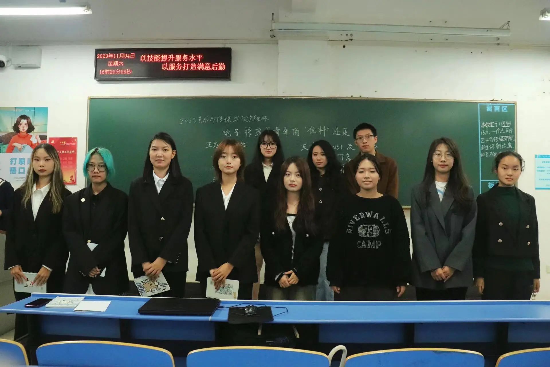 第三场辩论赛于北综楼311举行,邬惠阳、史书棋、王文杰三人担任主评。正方由设计五班组成,反方由广电二班与设计一班组成,双方围绕“电子榨菜是青年的佐料还是毒药”展开了激烈的辩论。主持人宣布比赛开始后,八位辩手展开了激烈的角逐。正方一辩首先从提升时间效率、提供个人情绪价值两方面有力论证了“电子榨菜是青年的佐料”这一观点,反方四辩也不甘示弱,针对对方辩友提出的观点抛出了自己的疑问。现场硝烟四起,辩手激情洋溢。自由辩论环节,辩论双方更是你来我往,你问我答,颇有“你方唱罢我登场”之势。总辩论结束,三位评委就正反两方存在的问题提出了建议,对辩论中双方的精彩表现进行了表扬,并宣布了本场比赛的胜利方——反方广电一班与设计一班,及本场最佳辩手——反方三辩刘奕然。