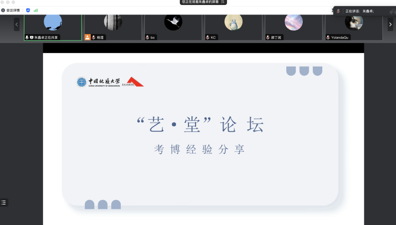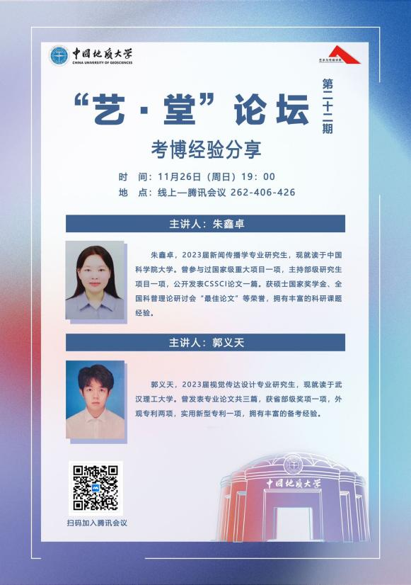 2023年11月26日晚上19:00,“艺·堂”论坛第二十三期考博经验分享会于线上腾讯会议平台顺利举行。学院邀请了2023届研究生毕业生、现就读于中国科学院大学的朱鑫卓和就读于武汉理工大学的郭义天进行经验分享。本次讲座由兼职辅导员杨滢主持。