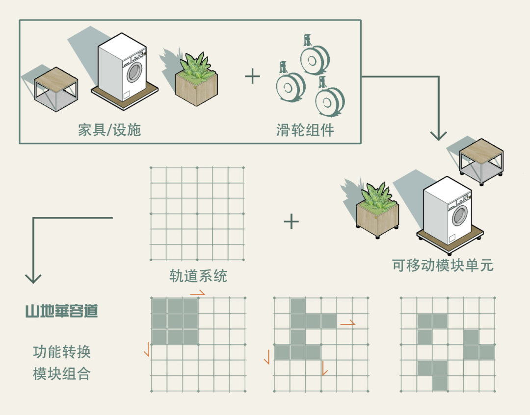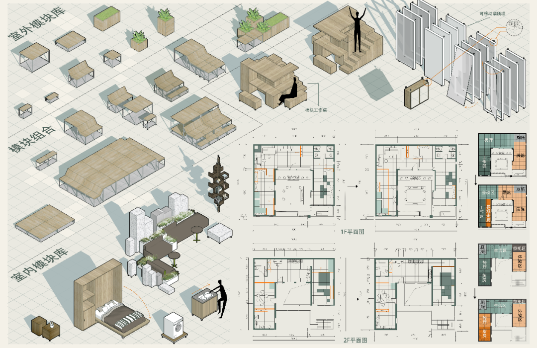 怎么样的设计才能与纣王殿村的现状结合,与触媒理论结合?这一系列问题让我调研回校后依旧进度缓慢,我想了很多方法,参考了很多大佬的方案,深夜emo的时候也曾默默流泪。就如程老师所说,“当你觉得设计很难的时候,可能他就快出来了。”我最终从中国古代益智类玩具——华容道中汲取了灵感,以模块化设计为核心,以主客共享为触媒因子,将村民的意愿和需求作为重要的考虑因素,通过改造乡村内的重要节点,建立可移动、可扩展的模块单元,涉及建筑、公共空间、交通组织、景观等不同空间,以满足不同场景下的不同需求,实现主客共享的功能,进而引发更大的触媒效应,促进整个村庄的发展,完成乡村活化。