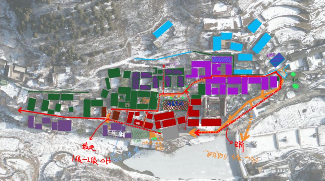 我带着一堆调查问卷,却只能问到对着我们嚎叫的狗子大黄(它对我们非常关照,可以说是无处不在)。更糟的是,村庄的建筑也是随着等高线而建,没有什么景观节点,又谈何更新,实在不是触媒理论应用的优选。