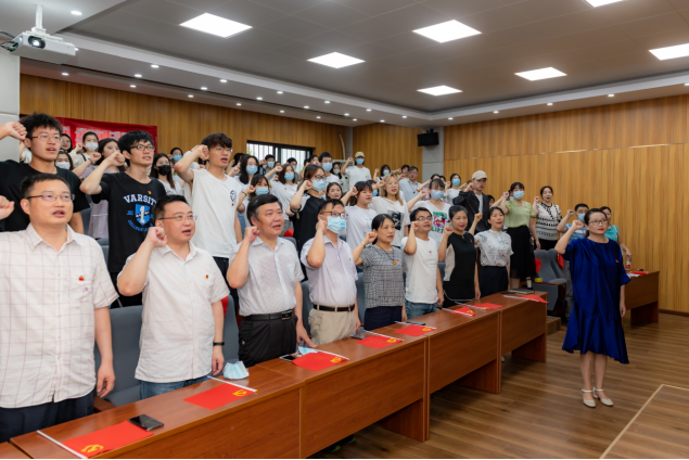 在观看大会直播之前,学院全体师生党员齐唱中华人民共和国国歌,并在学院党委书记郭秀蓉的带领下重温了入党誓词。随着现场灯光渐暗,大家的目光逐渐转移到荧幕,开始观看此次庆祝中国共产党成立100周年大会的直播画面。