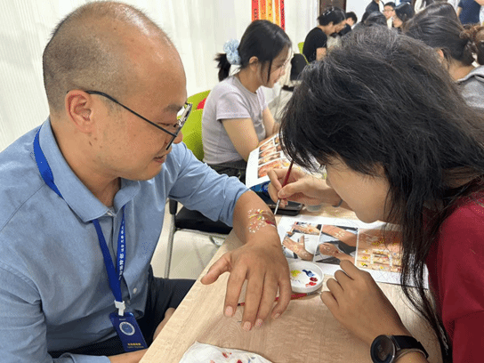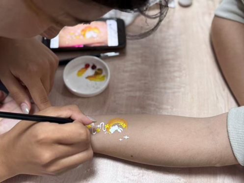 活动现场洋溢着浓厚的艺术气息与节日的欢快气氛。同学们充分发挥想象力,以面部、手部为画布,用缤纷的油彩描绘出对祖国的深情祝福与对传统佳节的美好期许。灵动可爱的玉兔、象征团圆的明月、鲜艳的五星红旗、绽放的绚烂礼花……一个个充满巧思的图案跃然于面颊之上,不仅是对绘画技艺的体验,更是一次情感的释放与表达。活动在轻松愉快的氛围中进行,欢声笑语不断,构成了一幅温馨动人的校园画卷。